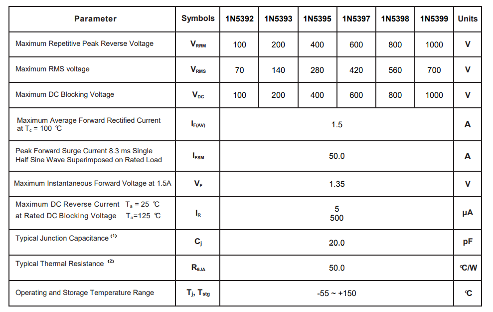插件整流二極管1N5392-1N5399的基本參數(shù):最大正向平均整流電流:1.5A;最高反向耐壓:1000V;最大正向峰值浪涌電流:50A;正向壓降:1.35V。最大反向漏電流:5.0uA。
