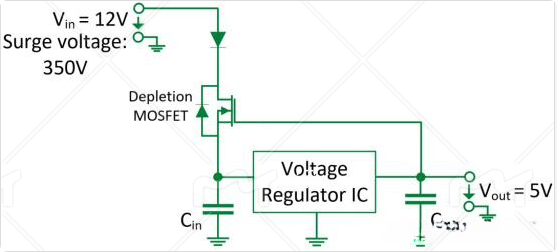 耗盡型MOSFET在線性電壓調(diào)節(jié)器電路中實(shí)施浪涌保護(hù),它采用源極跟隨器配置連接,而源極上的電壓將跟隨柵極上的電壓變化。耗盡型MOSFET的導(dǎo)通僅僅取決于柵極電壓,與漏極電壓無(wú)關(guān)。