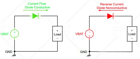作用:一般情況下負(fù)載電流沿二極管的正向流動(dòng)。但如果電池安裝的極性錯(cuò)誤,二極管就會(huì)反向偏置并阻斷反向電流,從而保護(hù)負(fù)載免受負(fù)電壓的影響。