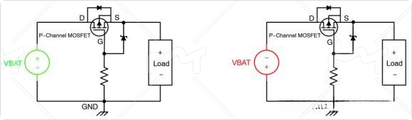 當(dāng)電池正確連接時(shí),即源極連接到 VBAT,要使 MOSFET 導(dǎo)通,柵源電壓(Vgs)必須高于閾值電壓(Vth)。因?yàn)樵礃O連接到 VBAT處,所以柵極電壓需要比 VBAT 高至少Vth(閾值電壓)。