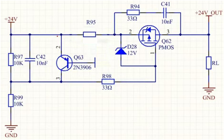 當 Q63 基極施加一個低電平信號(例如通過外部控制電路)時, Q63 導通,其集電極電壓被拉低。此時,MOS 管 Q62 的柵極電壓通過 R98 接地,柵源電壓Vgs 大于閾值電壓,MOS 管導通,電源通過 MOS 管向負載 RL 供電,輸出端 OUT 輸出 + 24V 電壓。