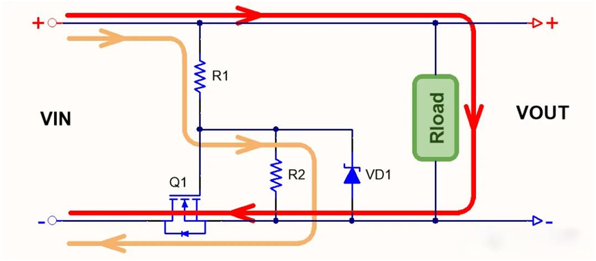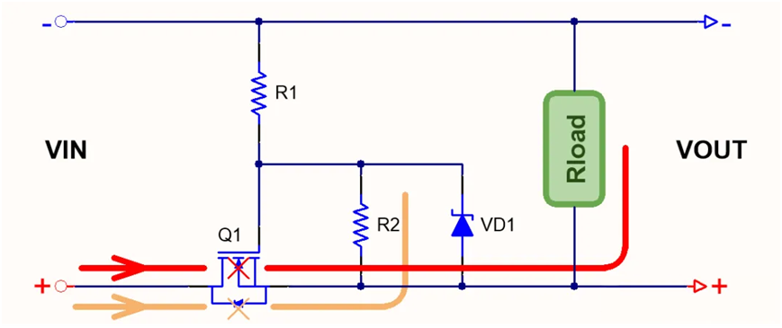 以NMOS為例,當電源輸入上正下負時,如下圖黃色線條所示電流路徑,經(jīng)過R1、R2以及 MOS 寄生二極管后到地。此時,R1 與 R2 分壓使得 GS 極電壓大于 MOS 導通電壓 Vgs,從而使 MOS 管導通,紅色線條所示的整個電路回路接通,電路正常工作。