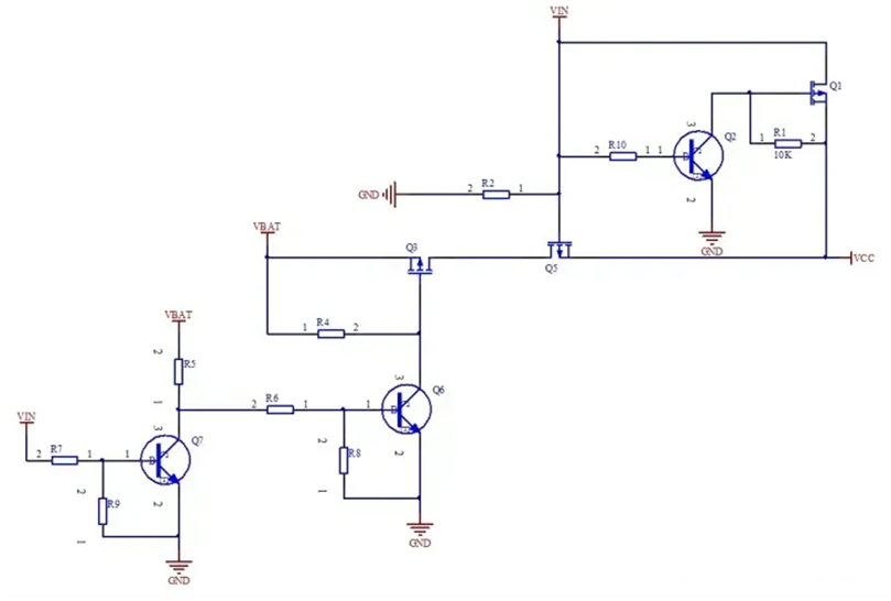 為此,項(xiàng)目中會(huì)采用復(fù)雜些的改進(jìn)電路(如圖 2 所示)。當(dāng)外部電源 VIN 接入,三極管 Q7 導(dǎo)通,Q6 截止,Q3 因柵源接電池電壓 VBAT 而截止,電池電壓無(wú)法到輸出端 VCC。同時(shí),VIN 經(jīng) Q1寄生二極管到輸出端 VCC,Q2 導(dǎo)通使 Q1 柵極拉低,Q1 導(dǎo)通且其寄生二極管截止,VIN 經(jīng) Q1 到 VCC,Q5 和其體二極管均截止,從而有效地防止了外部電源 VIN 對(duì)電池的非正規(guī)充電。