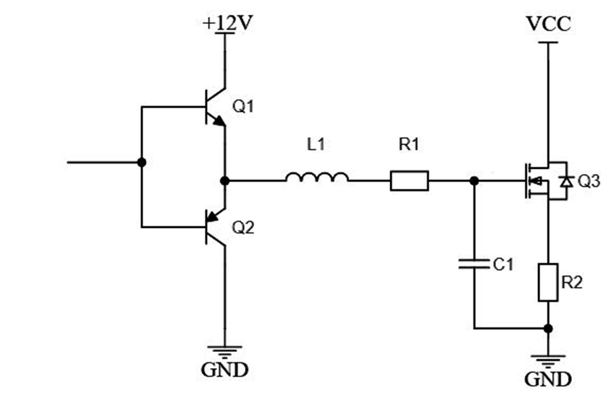 (如圖所示)為了向MOS管提供足夠驅(qū)動(dòng)電流,一般會(huì)用推挽電路,如三極管 Q1、Q2。實(shí)際線路中會(huì)存在感抗和電阻,如圖的等效電感 L1、等效電阻 R1,且 MOS 管 GD、GS 間有寄生電容(等效為 C1)。L1 和 C1就形成了諧振振蕩電路,因 R1 極小無法起阻尼作用,導(dǎo)致在驅(qū)動(dòng)脈沖上升沿、下降沿形成振蕩波形。