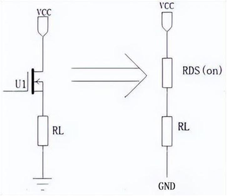 當(dāng) MOS 管完全導(dǎo)通時(shí),導(dǎo)通電阻就相當(dāng)于漏源極之間的“小電阻”,(如圖)VCC→RDS(on) →RL→GND形成回路。