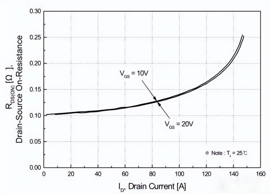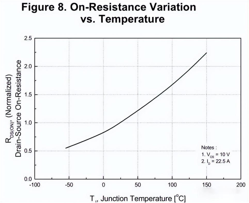 MOS的導(dǎo)通電阻隨溫度上升而上升,下圖顯示該MOS的導(dǎo)通電阻在結(jié)溫為130℃的時(shí)候,為20℃時(shí)候的2倍。