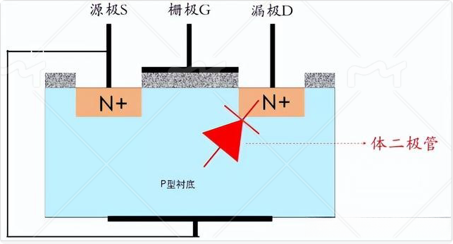 由于把襯底和S極短接了,也就相當(dāng)于在S極與D極之間形成了體二極管。而且這個(gè)二極管是由于制造工藝形成,無法避免的。