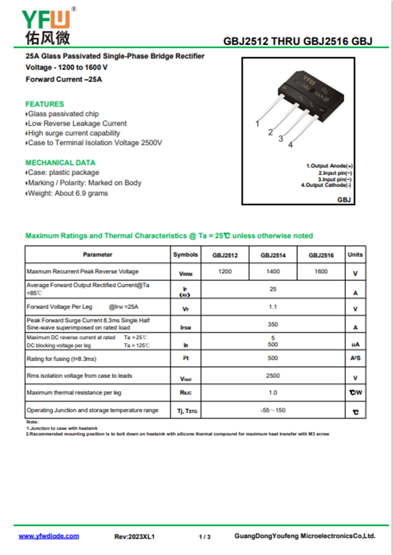 佑風(fēng)微原廠橋式整流器GBJ2512中文資料,PDF數(shù)據(jù)手冊,引腳圖,封裝規(guī)格,廠家原廠,找GBJ2512上佑風(fēng)微電子官網(wǎng)