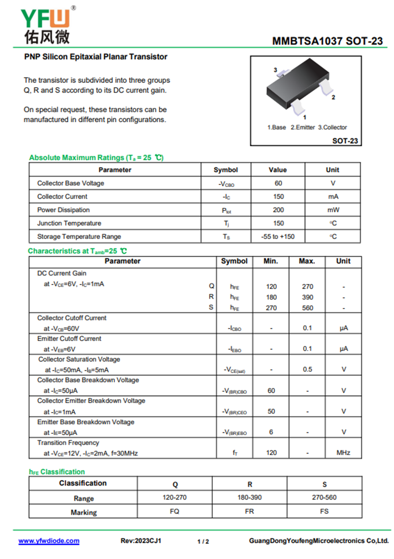 佑風(fēng)微原廠三極管 MMBTSA1037中文資料,PDF數(shù)據(jù)手冊(cè),引腳圖,封裝規(guī)格,廠家原廠,找MMBTSA1037上佑風(fēng)微電子官網(wǎng)