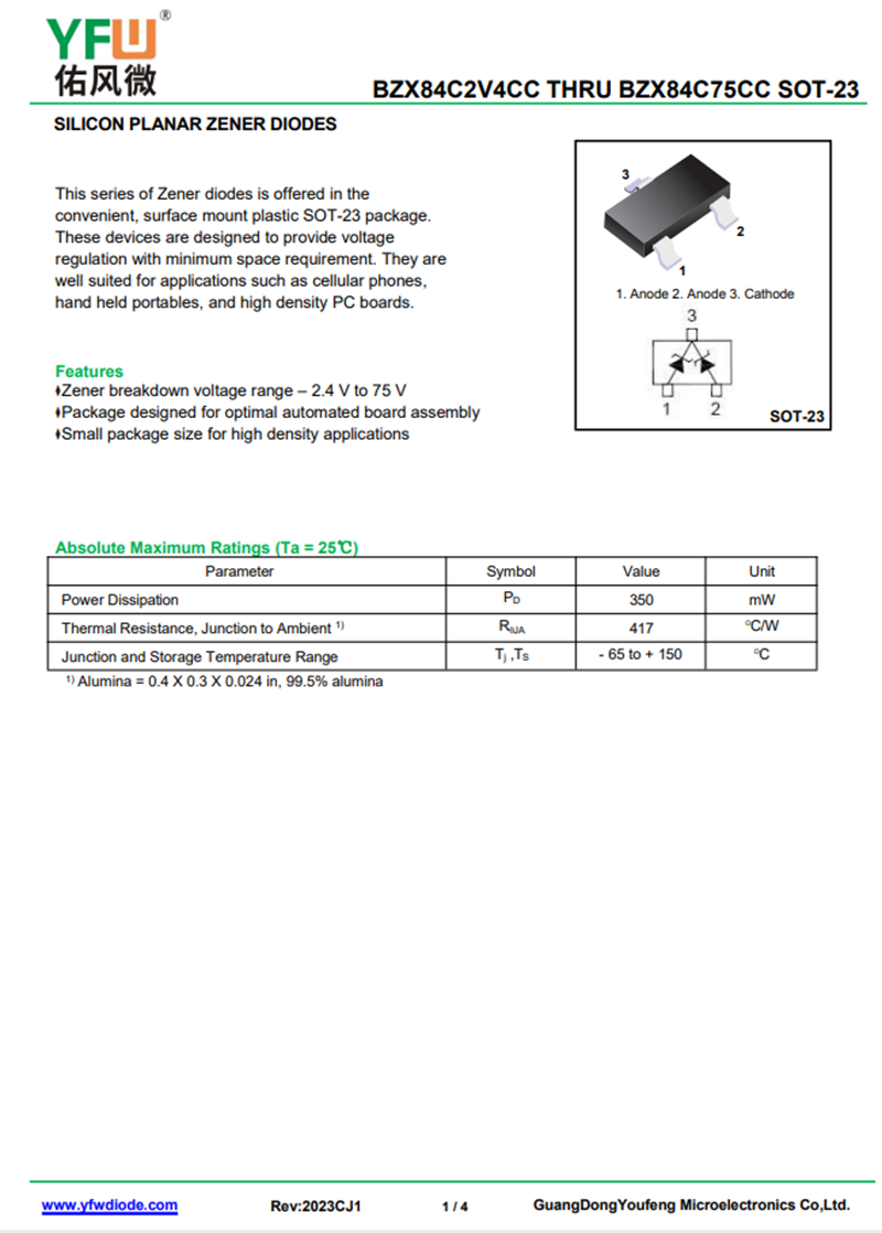 佑風(fēng)微原廠穩(wěn)壓二極管BZX84C3V3CC中文資料,PDF數(shù)據(jù)手冊,引腳圖,封裝規(guī)格,廠家原廠,找BZX84C3V3CC上佑風(fēng)微電子官網(wǎng)
