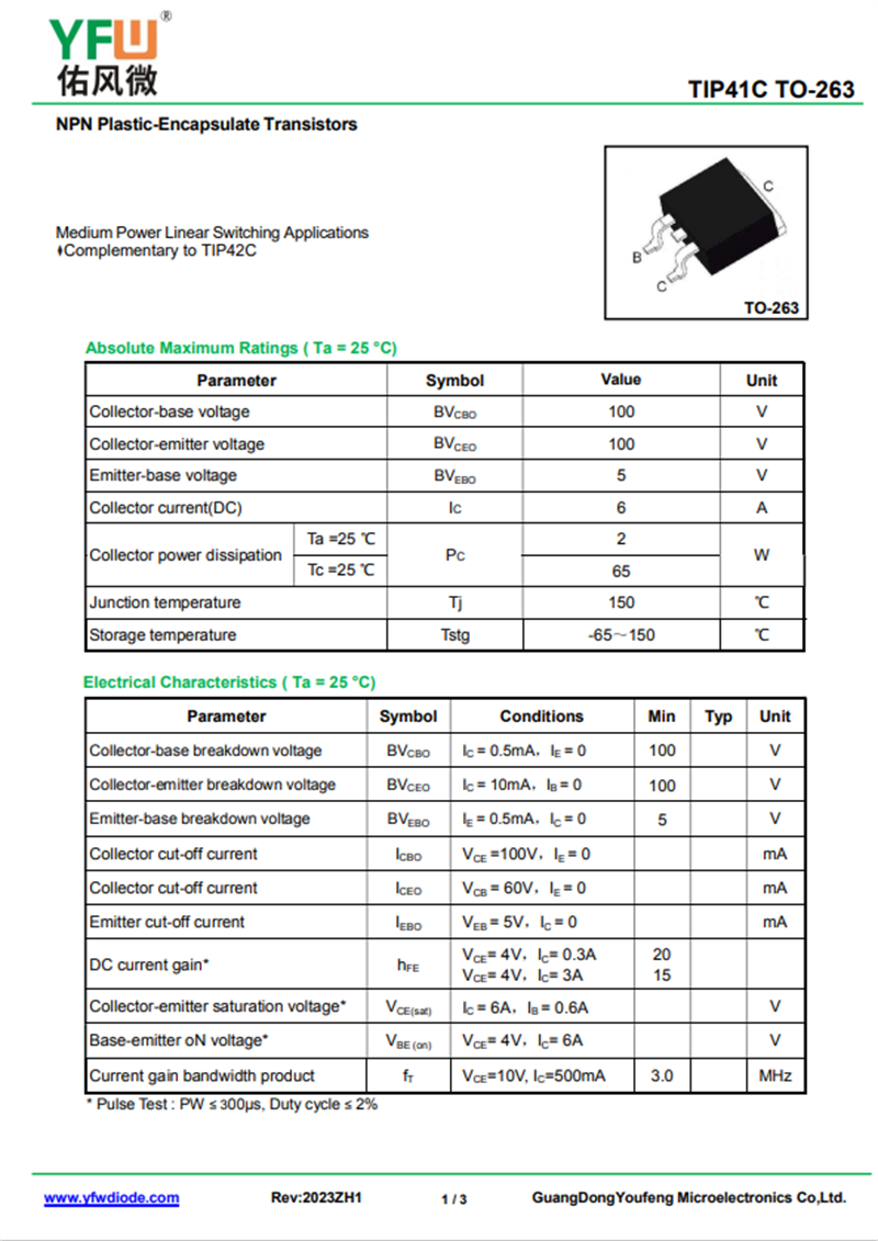 佑風微原廠三極管TIP41C中文資料,PDF數(shù)據(jù)手冊,引腳圖,封裝規(guī)格,廠家原廠,找TIP41C上佑風微電子官網(wǎng)