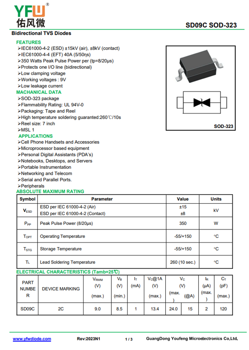 佑風(fēng)微原廠瞬態(tài)抑制二極管SD09C中文資料,PDF數(shù)據(jù)手冊(cè),引腳圖,封裝規(guī)格,廠家原廠,找SD09C上佑風(fēng)微電子官網(wǎng)