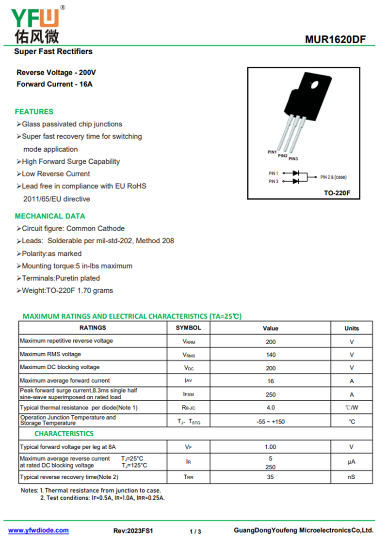 佑風(fēng)微原廠超快恢復(fù)整流器MUR1620DF中文資料,PDF數(shù)據(jù)手冊(cè),引腳圖,封裝規(guī)格,廠家原廠,找MUR1620DF上佑風(fēng)微電子官網(wǎng)