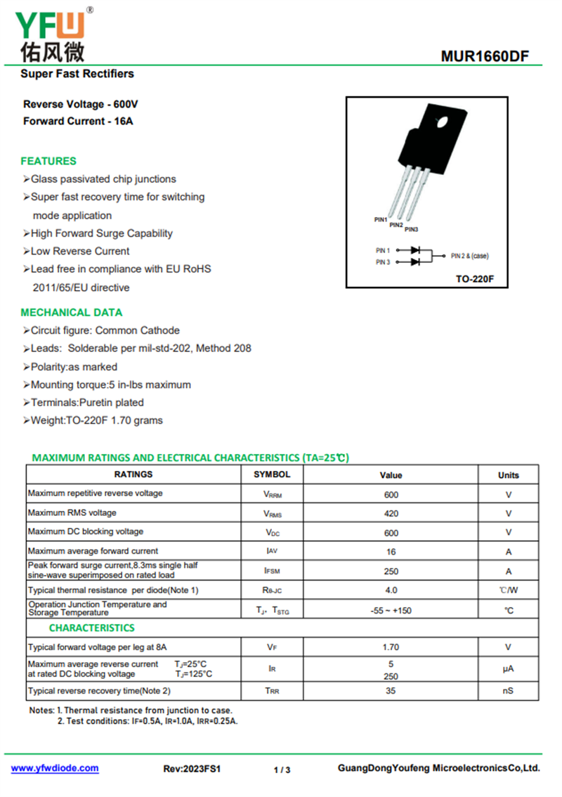 佑風(fēng)微原廠超快恢復(fù)整流器MUR1660DF中文資料,PDF數(shù)據(jù)手冊(cè),引腳圖,封裝規(guī)格,廠家原廠,找MUR1660DF上佑風(fēng)微電子官網(wǎng)