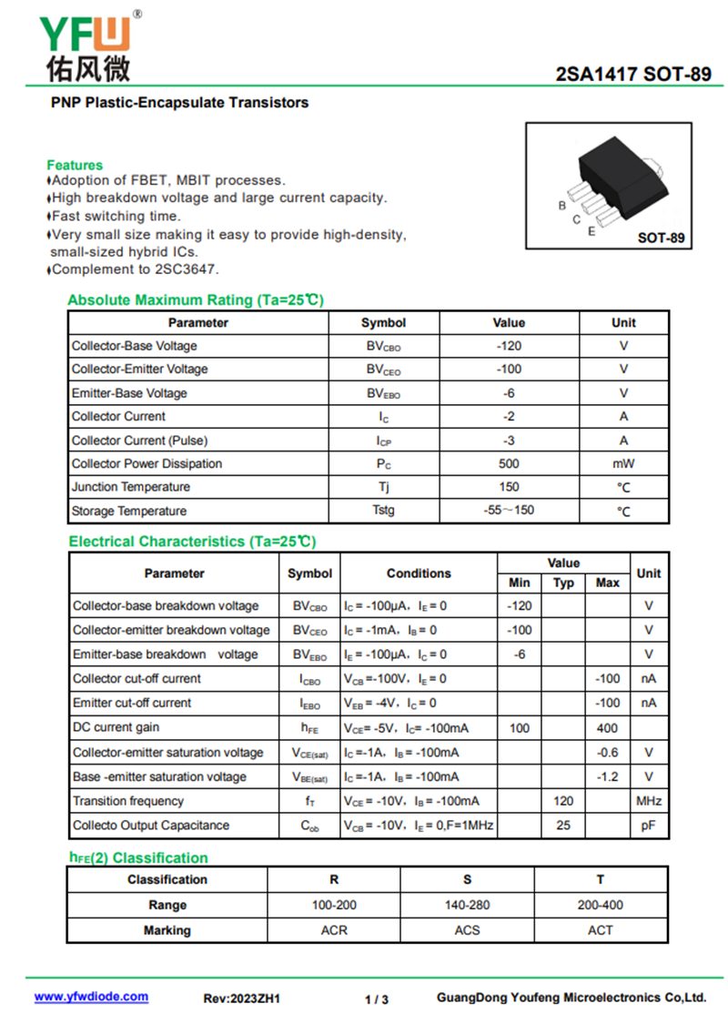 佑風微原廠三極管2SA1417-R中文資料,PDF數(shù)據(jù)手冊,引腳圖,封裝規(guī)格,廠家原廠,找2SA1417-R上佑風微電子官網