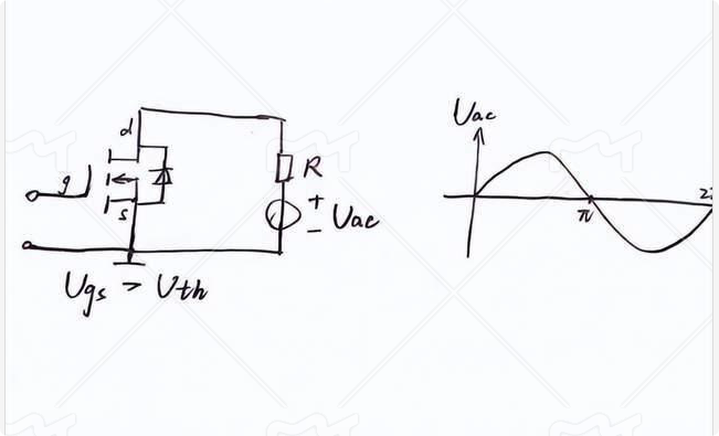 以圖中電路為例,當(dāng)我給柵極與源極之間一個恒壓源,使得Ugs>Uth,然后Uac是一個交流源,波形為右邊那個圖。