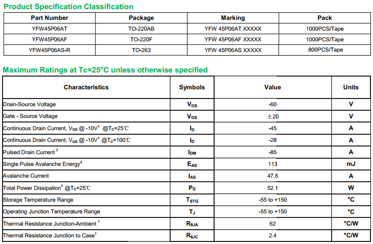 yfwdiode,MOSFEL YFW45P06AS data,PDF data book,Pin figure,Packaging specifications,Diode manufacturer YFW45P06AS diode
