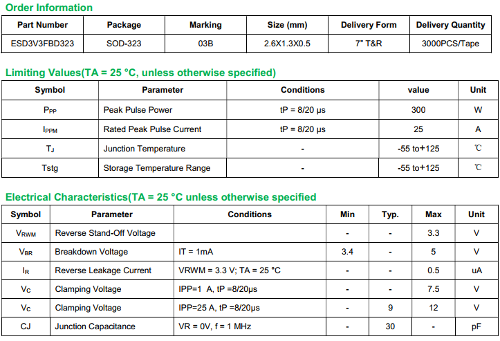 yfwdiode,Transient Voltage Suppressor ESD3V3FBD323 data,PDF data book,Pin figure,Packaging specifications,Diode manufacturer ESD3V3FBD323 diode