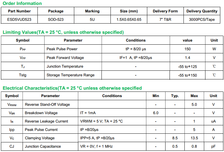 yfwdiode,Transient Voltage Suppressor ESD5VUD523 data,PDF data book,Pin figure,Packaging specifications,Diode manufacturer ESD5VUD523 diode