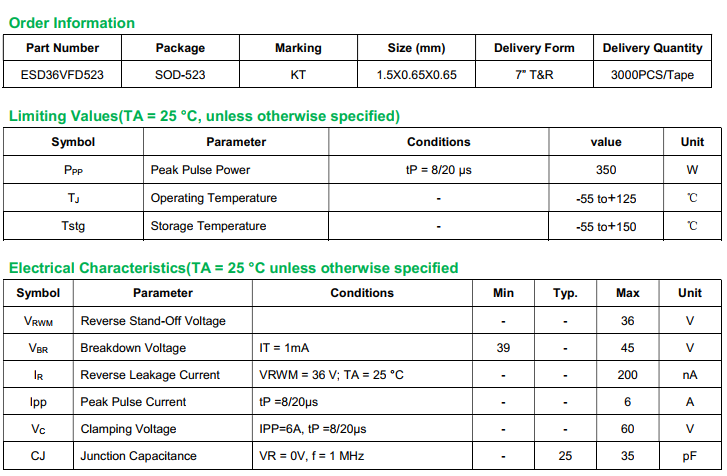 yfwdiode,Transient Voltage Suppressor ESD36VFD523 data,PDF data book,Pin figure,Packaging specifications,Diode manufacturer ESD36VFD523 diode