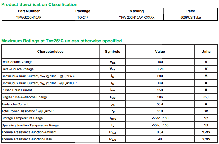 yfwdiode,Mosfet YFWG200N15AP data,PDF data book,Pin figure,Packaging specifications,Diode manufacturer YFWG200N15AP diode