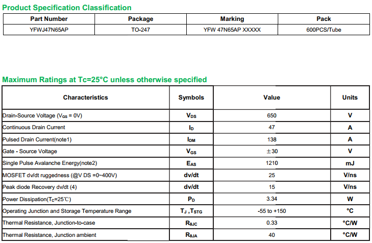 yfwdiode,Mosfet YFWJ47N65AP data,PDF data book,Pin figure,Packaging specifications,Diode manufacturer YFWJ47N65AP diode