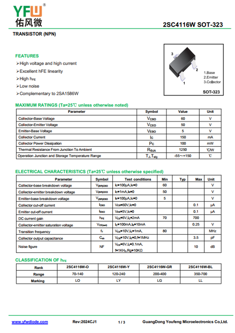 yfwdiode,Transistor 2SC4116W-Y data,PDF data book,Pin figure,Packaging specifications,Diode manufacturer 2SC4116W-Y diode