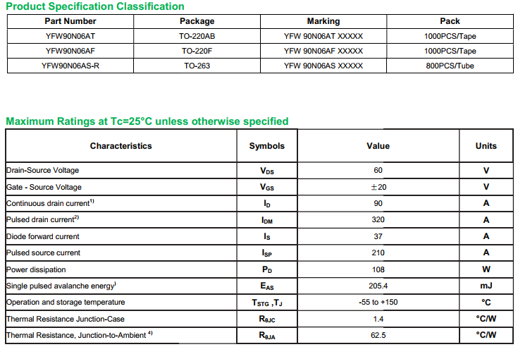 yfwdiode,MOSFEL YFW90N06AT data,PDF data book,Pin figure,Packaging specifications,Diode manufacturer YFW90N06AT diode