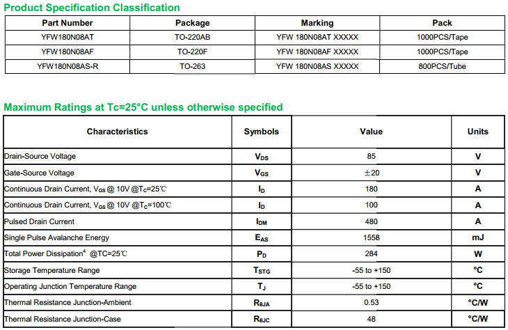 yfwdiode,MOSFEL YFW180N08AS data,PDF data book,Pin figure,Packaging specifications,Diode manufacturer YFW180N08AS diode