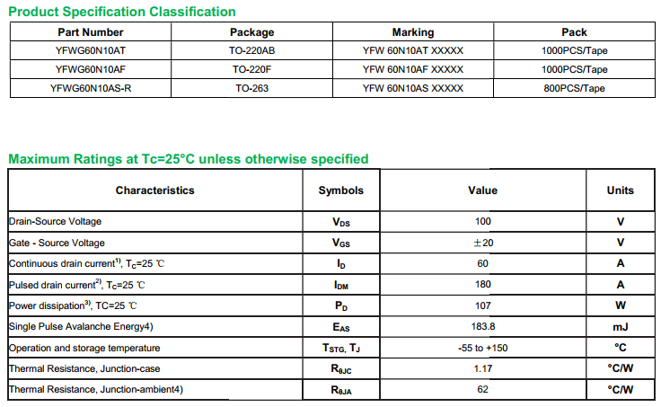yfwdiode,MOSFEL YFWG60N10AT data,PDF data book,Pin figure,Packaging specifications,Diode manufacturer YFWG60N10AT diode