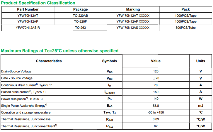 yfwdiode,MOSFEL YFW70N12AT data,PDF data book,Pin figure,Packaging specifications,Diode manufacturer YFW70N12AT diode