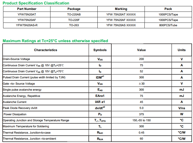yfwdiode,MOSFEL YFW75N20AS data,PDF data book,Pin figure,Packaging specifications,Diode manufacturer YFW75N20AS diode