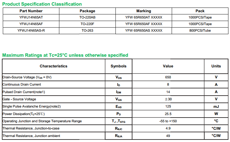yfwdiode,MOSFEL YFWJ14N65AT data,PDF data book,Pin figure,Packaging specifications,Diode manufacturer YFWJ14N65AT diode