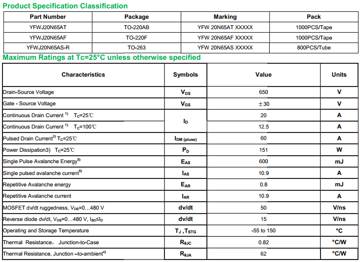 yfwdiode,MOSFEL YFWJ20N65AS data,PDF data book,Pin figure,Packaging specifications,Diode manufacturer YFWJ20N65AS diode
